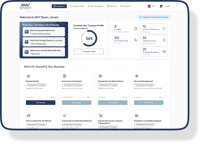 SMVBasen.dk solves this by gathering professional tools and AI automation that make business development easy, fast and affordable – and you can always add a personal consultant at a fair price when you want extra sparring